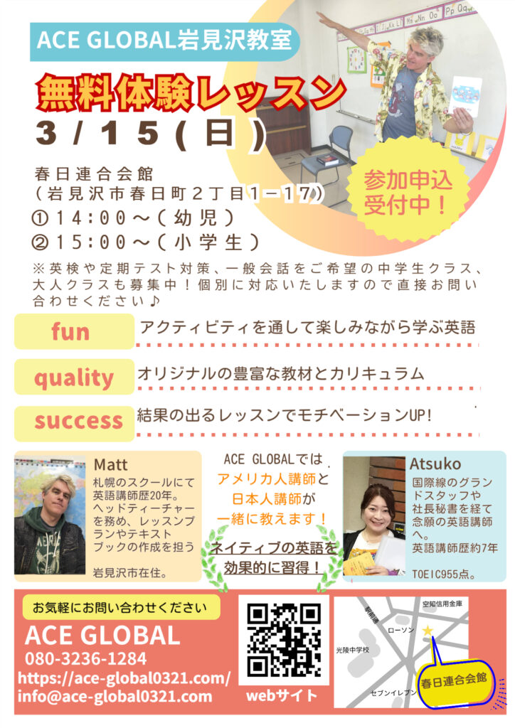 3/15(日)に、無料体験レッスン行います。英語に興味がありましたら、是非一度ACE GLOBALのレッスンを体験しにいらしてください☆