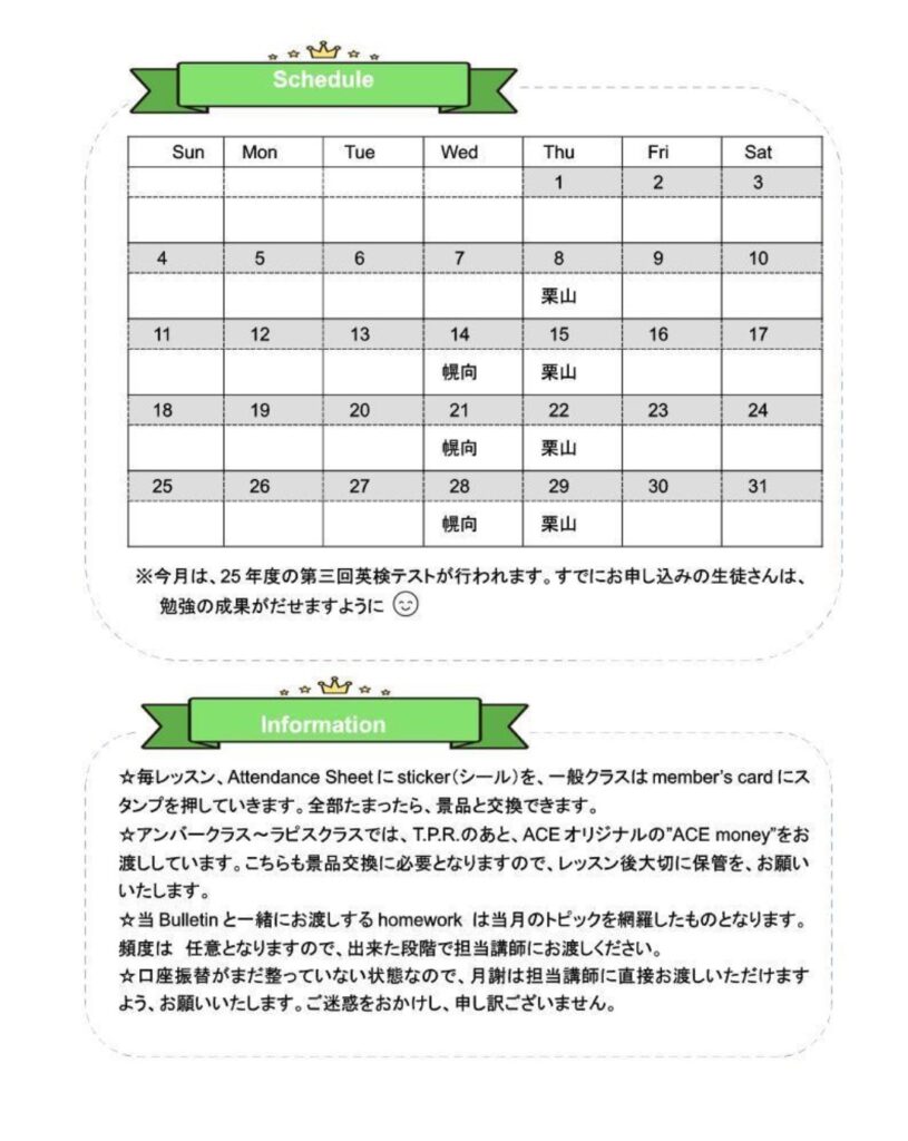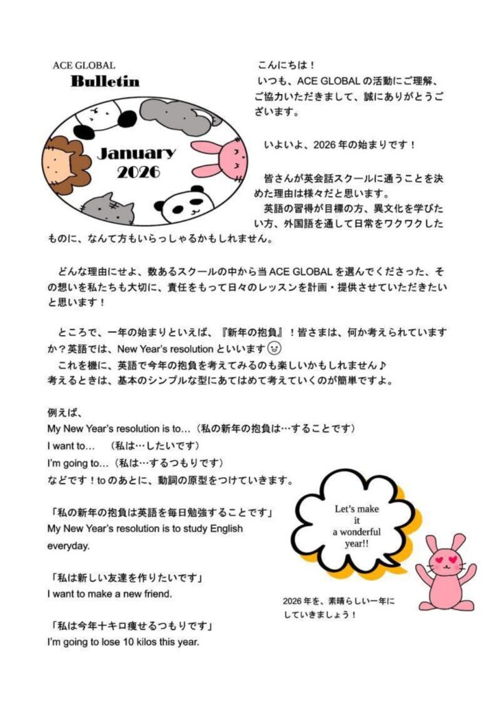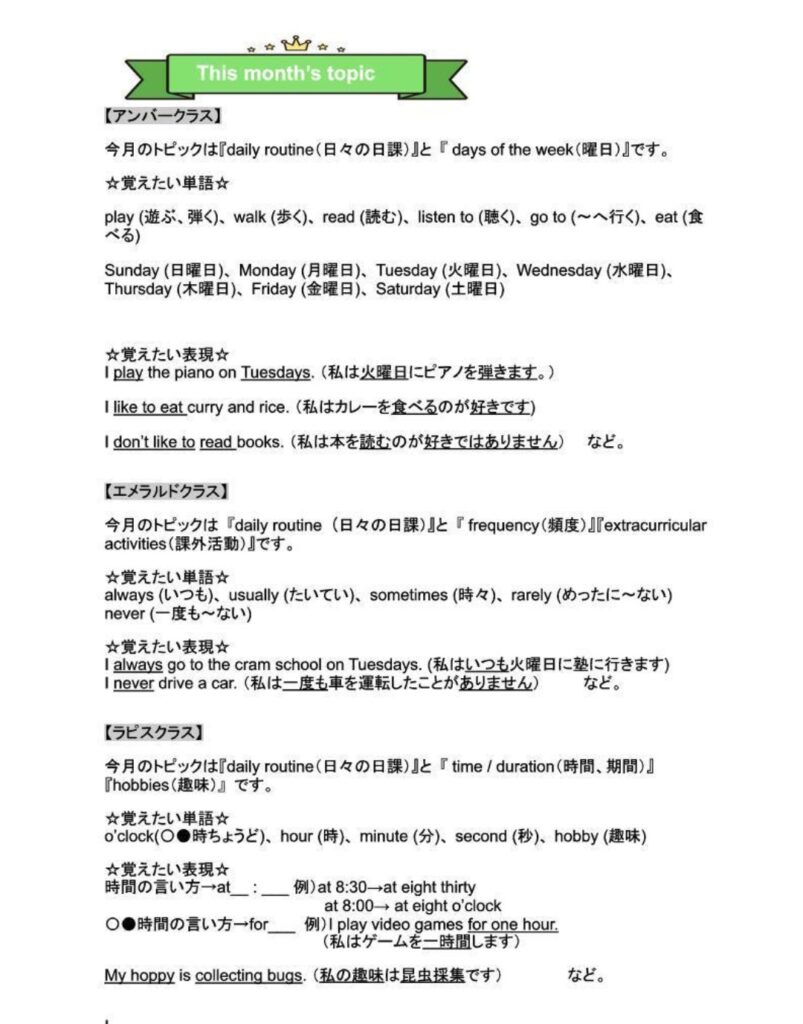 1月は、daily routineを軸に学んでいきたいと思います。覚えたい単語や表現は、This month’s topicに載っていますので、おうちでの学習の参考にしてくださいね! カテゴリー: bulletinlesson 0件のコメント コメントを残す コメントをキャンセルメールアドレスが公開されることはありません。 ※ が付いている欄は必須項目です 名前 * メール * サイト ご意見、ご感想をお願いします。 次回のコメントで使用するためブラウザーに自分の名前、メールアドレス、サイトを保存する。