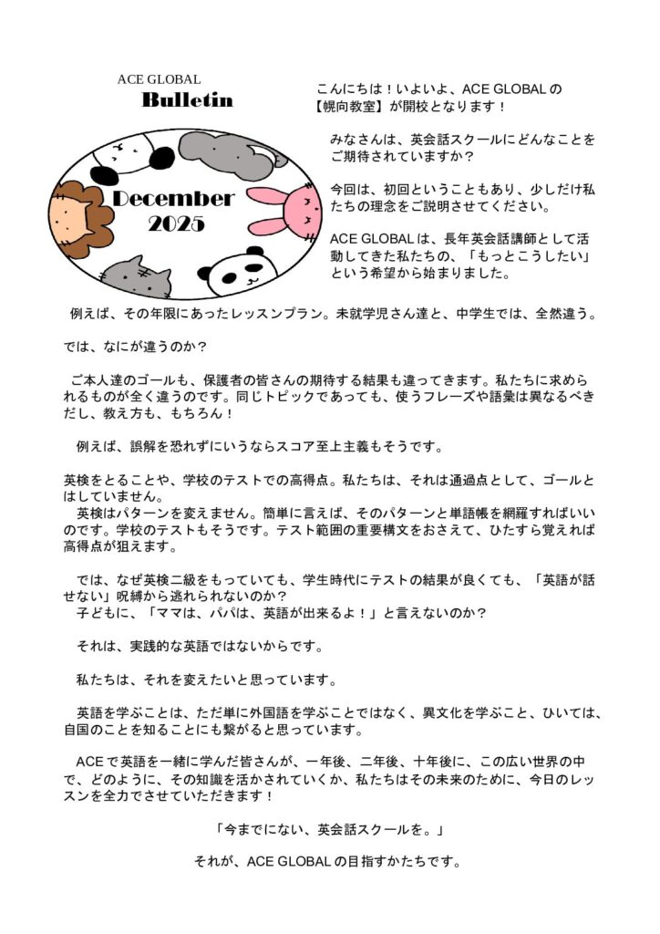 ACEでは、月に一度bulletinをお渡ししています。次の月に勉強するトピックや単語・表現、各スクールの予定や事務局からのお知らせを載せています。紙ベースでもお渡ししていますので、是非ご覧ください。 カテゴリー: bulletin幌向栗山 タグ: Second 0件のコメント コメントを残す コメントをキャンセルメールアドレスが公開されることはありません。 ※ が付いている欄は必須項目です 名前 * メール * サイト ご意見、ご感想をお願いします。 次回のコメントで使用するためブラウザーに自分の名前、メールアドレス、サイトを保存する。